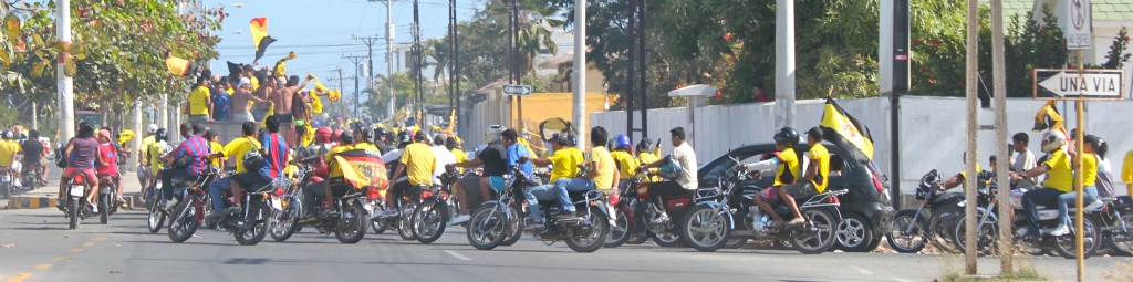 There is only one road from Salinas to Guayaquil, and it had been taken over by this impromptu parade. Fans on motorcycles, or bikes, hanging out car windows or off the backs of pick-up trucks surrounded us! Bright yellow jerseys bearing beer ads and the Barcelona crest decorated every body, head, flagpole and car door. I think we counted 27 passengers in one pick-up bed straddling the edges to wave their flags high. Several trucks and cars carried giant speakers blasting the Barcelona theme song, and the discordant “beep-beep … beep-beep” for “Bar-ce … lo-na” could be heard for miles. When the parade had squeezed three lanes of traffic into a two-lane road, they spilled over into the oncoming lanes, forcing oncoming traffic to either pile onto the shoulder or just join the parade.