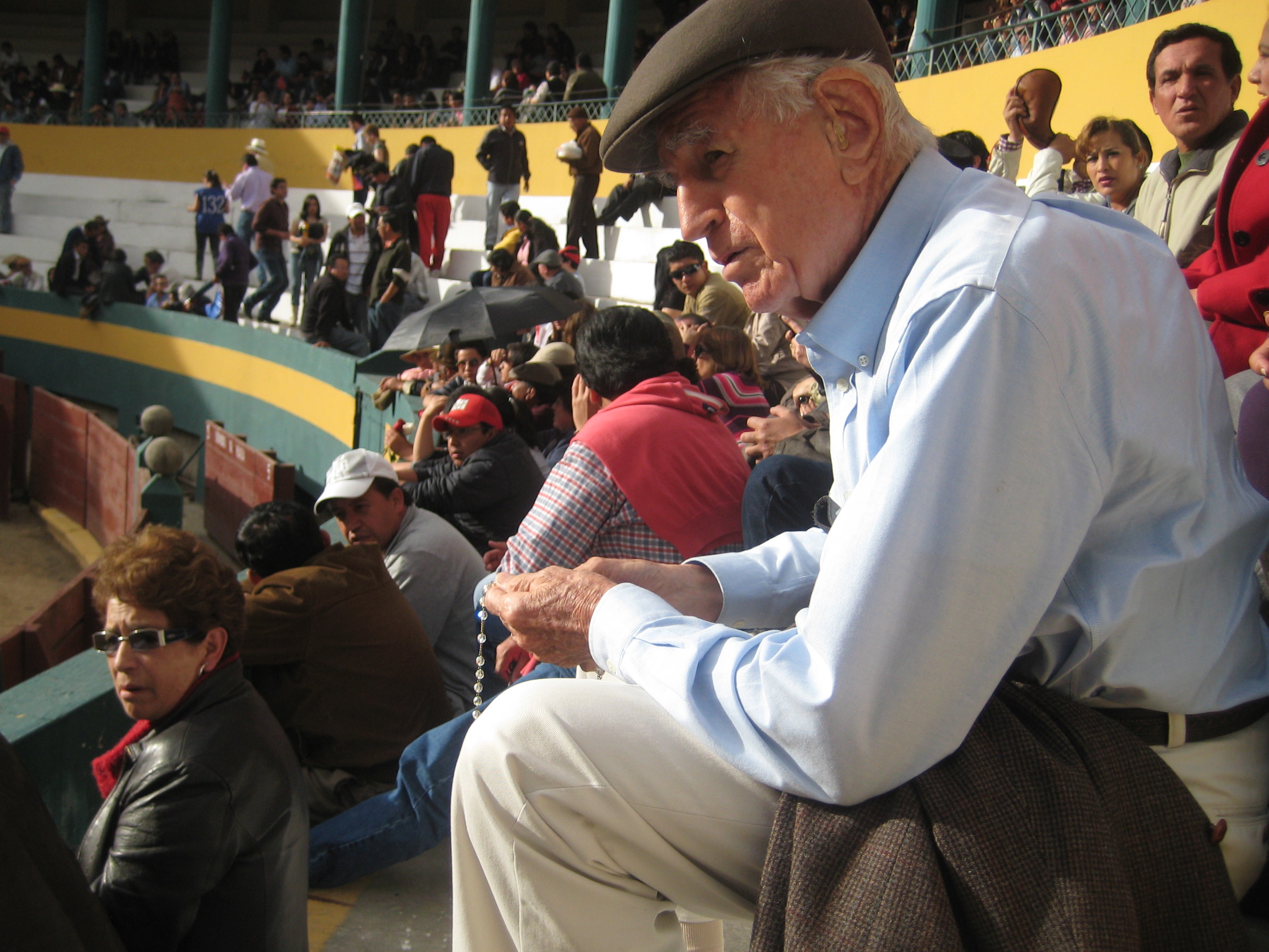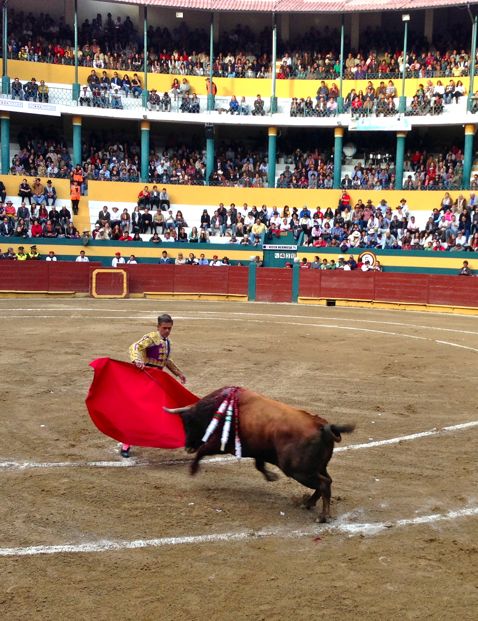 Sometimes, recently, watching bullfights in Ecuador feels like a dying tradition. When I was younger, bullfights were hugely popular, packed with spectators of all ages, anywhere they were held. The president of Ecuador began an aggressive “anti-taurino” campaign in 2010. In 2011, he held a referendum that included a question on the killing of bulls at the end of the fight, as has been done since bullfighting began. The referendum was by canton, and as a result, in some parts of Ecuador (including the capital city), the killing of bulls in a fight is now outlawed. More important, the campaign created a controversy about bullfights, which had not previously been significant to most Ecuadorians. It reflected political interests and provided a diversion from real issues. In response, some areas where the full fight is still legal declared bullfighting as cultural patrimony, so that it can never be outlawed. So bullfighting aficionados flock to these places: last Saturday’s fight in Riobamba was packed.